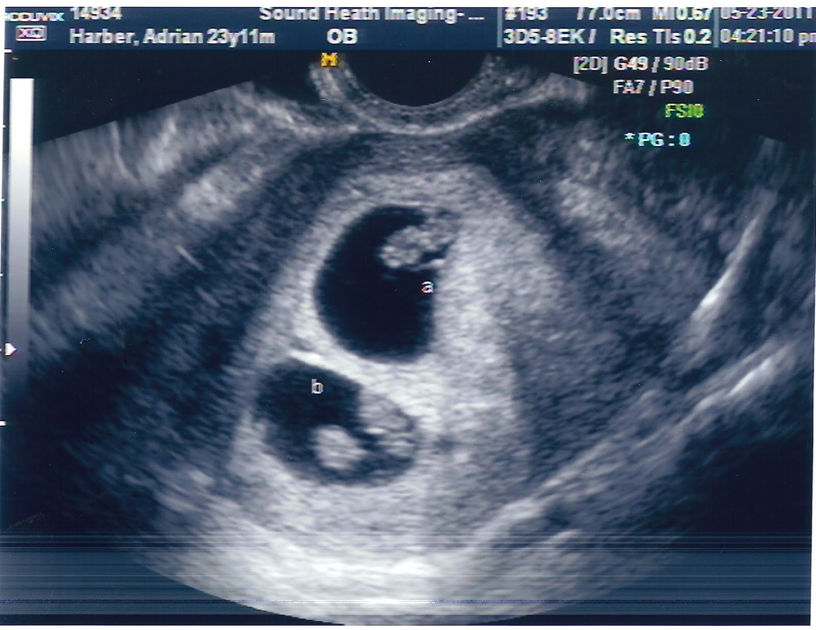I know they don't look like babies yet, but I still think they're adorable! :D Baby A's heartbeat was 152 bpm and Baby B was at 164 bpm. :)